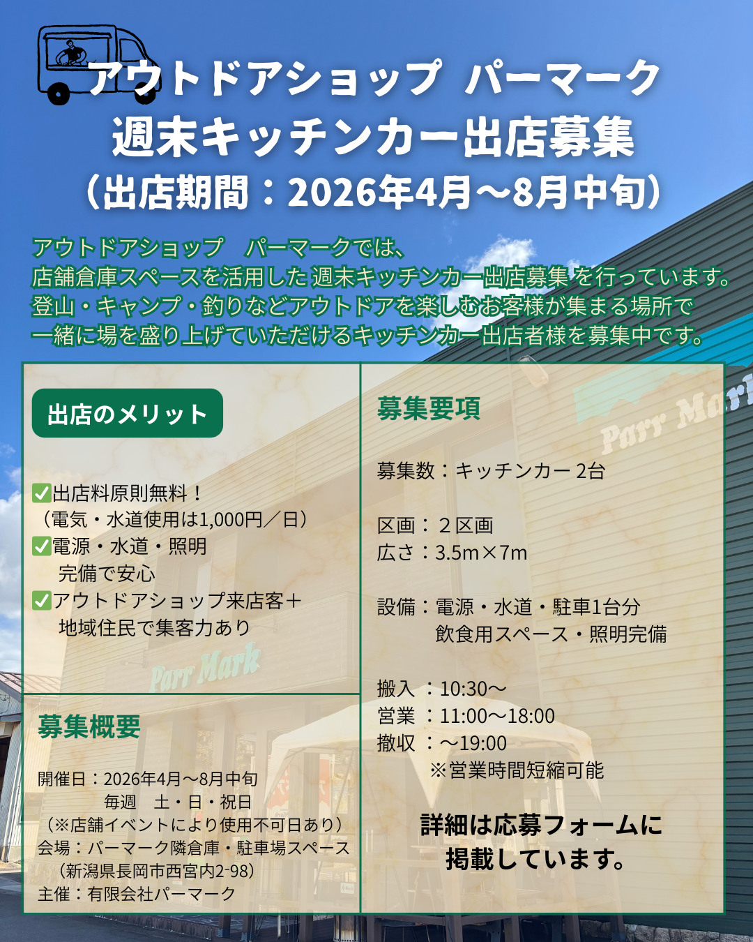 アウトドアショップ パーマークでは、 店舗に隣接する倉庫スペースおよび屋外エリアを活用し、 週末を中心にキッチンカー出店を行っていただける事業者さまを募集中です。