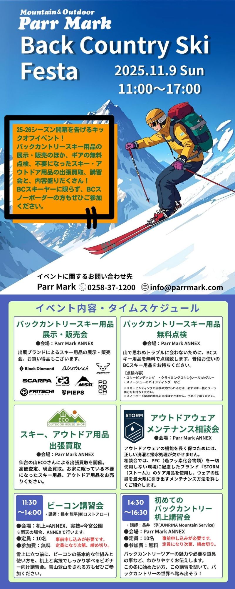 ■日時:11月9日(日) 11:00〜17:00 ■会場:ParrMark ANNEX(店舗隣) ■イベント内容 【バックカントリースキー用品 展示販売会】 出展ブランドによるバックカントリースキー用品を展示・販売致します。お買い得品もご用意いたします。
