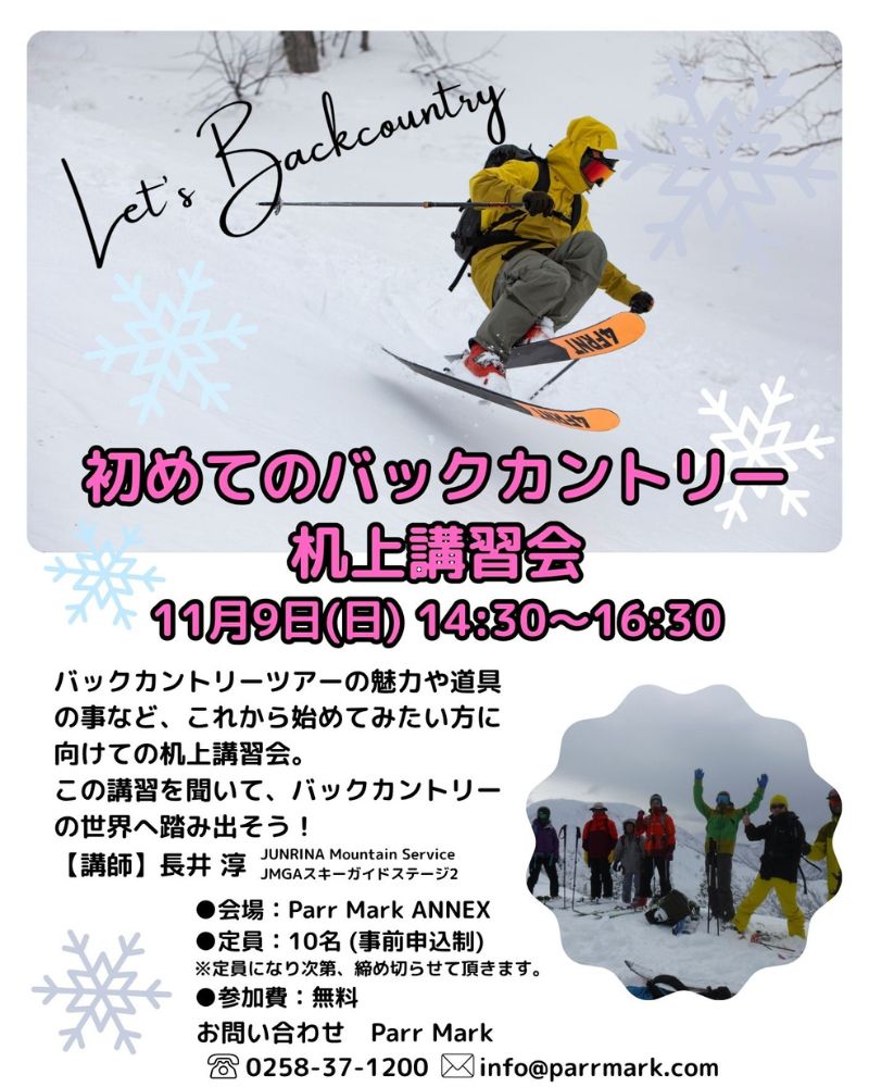 バックカントリースキー・スノーボードに興味があり、始めて見たいと思っている方が多くいらっしゃると思います。 バックカントリーツアーの魅力や道具の事など、インターネットなどから色々情報を得ることはできますが、このイベントでは越後湯沢を拠点にスキーガイドをしている長井 淳さんから、よりリアルで生の声を聞くことができる機会です。 この講習会に参加して、バックカントリーへの世界へ踏み出そう!