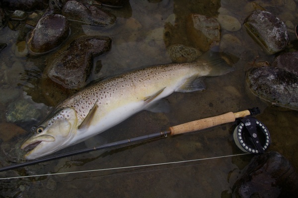 70cmオーバーのブラウンを何匹も見たがことごとく逃げられやっとキャッチした64cm、5.5ポンド。クリップルダンの18番でした。尻ビレの大きさが特徴的です。それとスコットのニューG2は最高でした! |