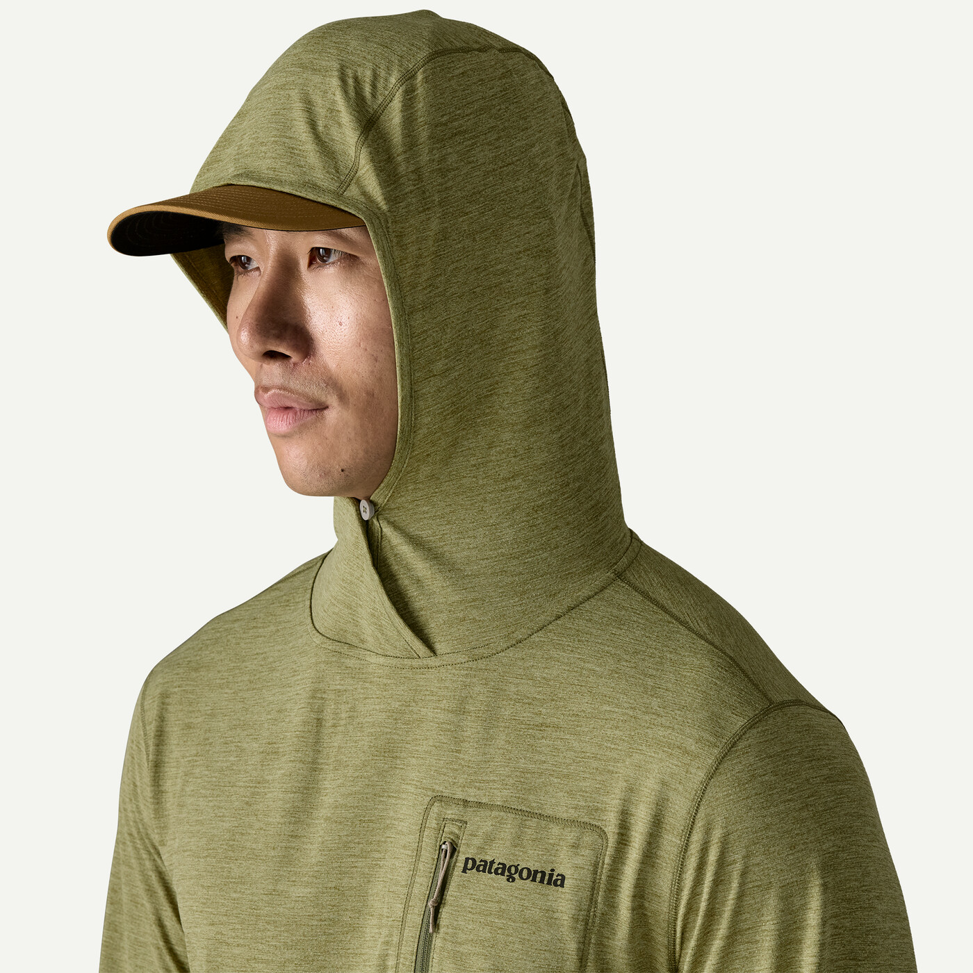 ゆったりとしたフードはボタン付きで、日除け効果を高めるために野球帽の上にもフィットする構造