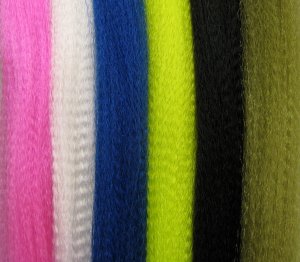 スープリームヘアーはスーパーヘアー、ユニークヘアー等と同じタイプのマテリアルで、ボブ・ポポビクスのサーフキャンディーなど、ソルトフライに欠かせないマテリアルです。ファイバーが適度に縮れているため、トリミングによるミノーシェイプが作りやすく、また張りが強く、水中でシルエットが崩れたり、フックに絡んだりしにくいです。長さも25㎝以上あるので、かなり大きなフライにも対応します。