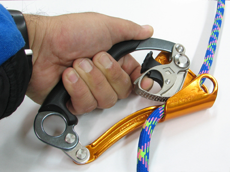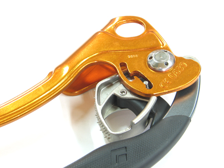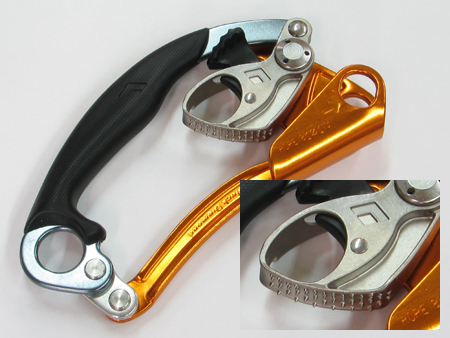 | | 4つの可動部を持つ「4バーリンク」で構成された機能的なデザイン。トリガーの黒いプラスチックを固定するリベット以外に4ヶ所の可動部があるのがわかります。カムが動いてロープをロックするのはもちろん、クライマーの荷重が更に強力にカムをロックさせる構造です。カムも大きくいかにも利きそうです。