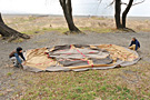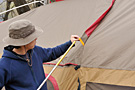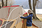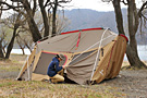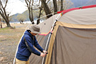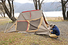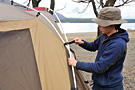 ランドロックの奥のスペースにインナーテントを吊り下げて約3.7×2.4mのベッドルームを備える標準セッティングです。大人2人、子供3人が余裕を持って寝ることができます。フロント左右、後方にワイドな出入口パネルを設けており楽に出入りすることができます。また室内の換気も容易です。約4m×3.85mのリビングには5〜6人分のリビング・キッチンシステムをレイアウトすることが可能。人数分のテント&タープの占有面積よりコンパクトなレイアウトです。 |