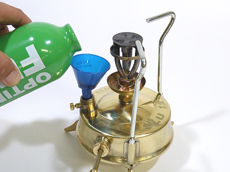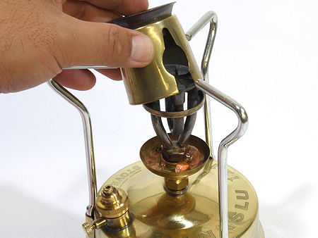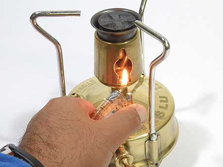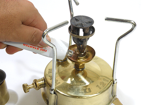 燃料の灯油を気化させるためにバーナーの管をよく熱します。色々な燃料を使った方法がありますが、写真のようなチューブタイプがおすすめ。ススもでず持ち運びも簡単。 |