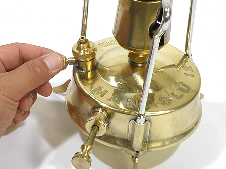 | | 火力調整はこのツマミを少し緩めタンクの圧力を抜くことで行います。火力を上げたい時は再びポンピング!消火はネジを緩めタンクの圧力を完全に抜きます。いまどきのバーナーにはない方法でかえって新鮮に感じるのですが、いかがでしょう。 |