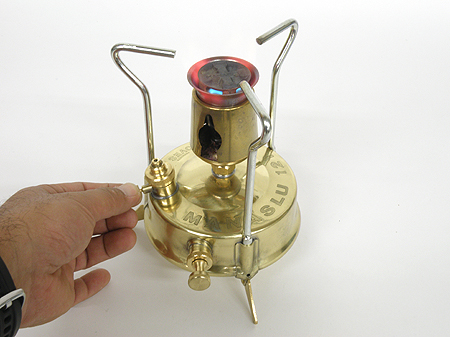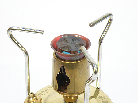 | | 最後はポンピングでタンクの圧力を上げていきます。シューっという音が聞こえてきてうまくプレヒートの火が残っていれば その火でバーナー部分に着火します。着火しなかったらライターなどでバーナーのてっぺんに火をつけます。