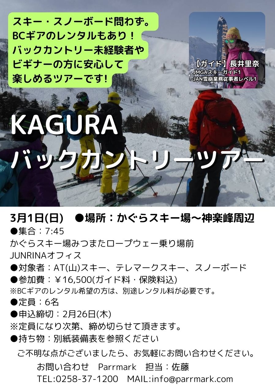 ■開催日:2026年3月1日(日) ■ツアーコース:かぐらスキー場〜神楽峰周辺 ※天候、積雪状況によりツアーコースが変更になる場合がございますことを、予めご了承ください。 ■集合場所・時間:かぐらスキー場・みつまたロープウェー乗り場脇 JUNRINAオフィス・7:45 ※集合場所はこちらから確認してください。 ■解散:15:30〜16:00頃の予定 ■参加費:16,500円 (ガイド料、保険料込) ※別途、リフト1日券が必要です。希望される方には割引リフト券(通常7,500円のところ、6,300円にて)をご用意できます。お申し込み時にお申し付けください。 ■定員:6名 ■申し込み締め切り:2026年2月26日(木) ※定員になり次第、締め切らせて頂きます。 ■対象:テレマークスキー、ATスキー(山スキー)、スノーボード ※滑走技術について:うまくターンができなくても、どんな雪質でもこなせる方。 スキー場の圧雪斜面はある程度どこでも滑走可能で、深雪にも対応できる方。 (滑走レベル初級者の方はご遠慮ください) ■地図:国土地理院発行:苗場山(1/25,000図) ■装備:下記の【バックカントリーツアー装備表』をクリックして、日帰り基本装備を参考に揃えてください。 【バックカントリーツアー装備表】 ※レンタル可能な装備:ビーコン、プローブ、ショベル、ポール、バックパック (別途レンタル料 1,100円が必要) ※ATスキー、スプリットボードをお持ちでない方には、「ATスキー+シール」、「スプリットボード+シール」のレンタルもあり(別途 5,500円必要) ※テレマークスキーのレンタルはございません。