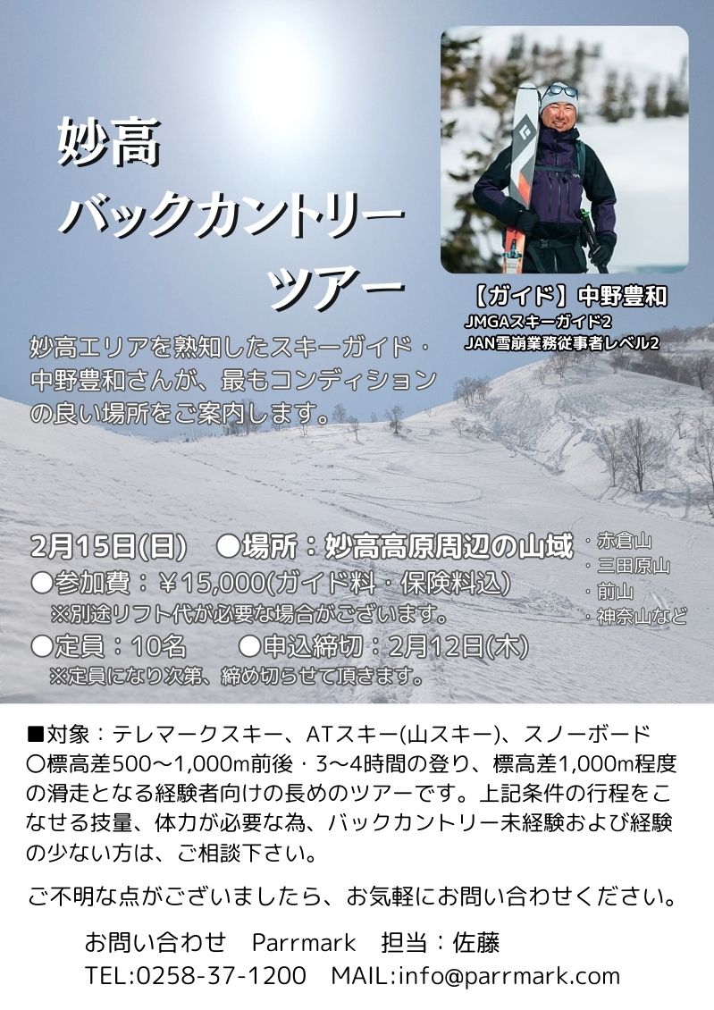 ■開催日:2026年2月15日(日) ■ツアーコース:妙高高原周辺(赤倉山・三田原山・前山・神奈山など) ※天候、積雪状況により、コースが変更になる場合がございますことを、予めご了承ください。 ■集合場所、集合時間:前日までに参加者にご連絡致します。 ■参加費:15,000円 (ガイド料、保険料含む) ※別途、リフト代が必要な場合がございます。 ■定員:10名 ■申し込み締め切り:2026年2月12日(木) ※定員になり次第、締め切らせて頂きます。 ■対象:テレマークスキー、ATスキー(山スキー)、スノーボード 〇標高差500〜1,000メートル前後・3〜4時間の登り、標高差1,000メートル程度の滑走となる経験者向けの長めのツアーです。バックカントリー未経験および経験の少ない方は、下記の項目に該当するかご確認下さい。 〇滑走技術について:スキー場の上級斜面、非圧雪斜面をある程度どこでもスムーズにターンできる方で、深雪・クラスト、重い雪など悪雪にも対応できる方。うまくターンができなくても、確実にスピードコントロールができ、安全に滑り降りれる方なら参加可能です。 〇体力レベル:標高差500〜1,000メートル前後の登り、標高差1,000メートル程度の滑走をこなせる体力をお持ちの方。 ※滑走技術、体力レベルに不安やご不明な点がある方は、お申込み前にお問い合わせください。特に未経験の方や経験の浅い方で上記項目に該当しない場合、レベルの優しいツアーに参加するなど経験を積んでからお申込みください。