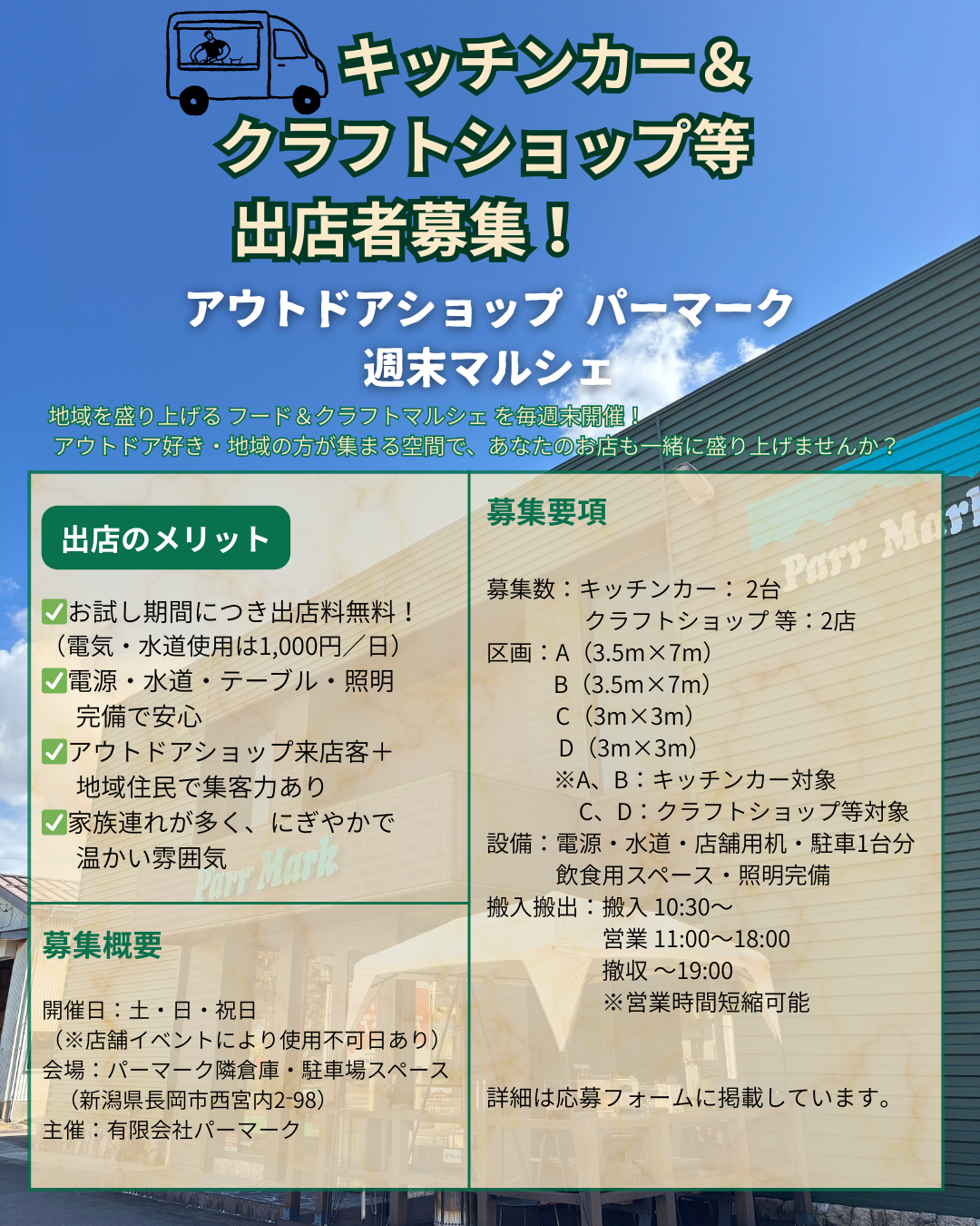 | アウトドアショップ「パーマーク」では、週末ごとにマルシェを開催します。 そこで、キッチンカーやクラフトショップなど、地域の方々とともににぎわいをつくってくださる出店者さまを募集中です。