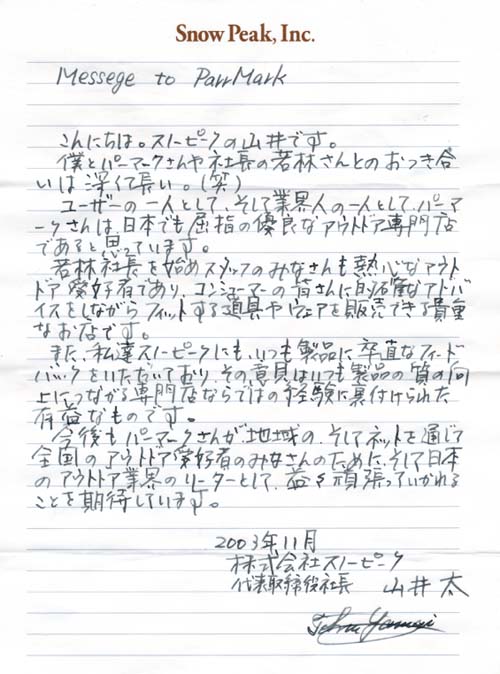 2003年11月 株式会社スノーピーク 代表取締役 山井 太 |