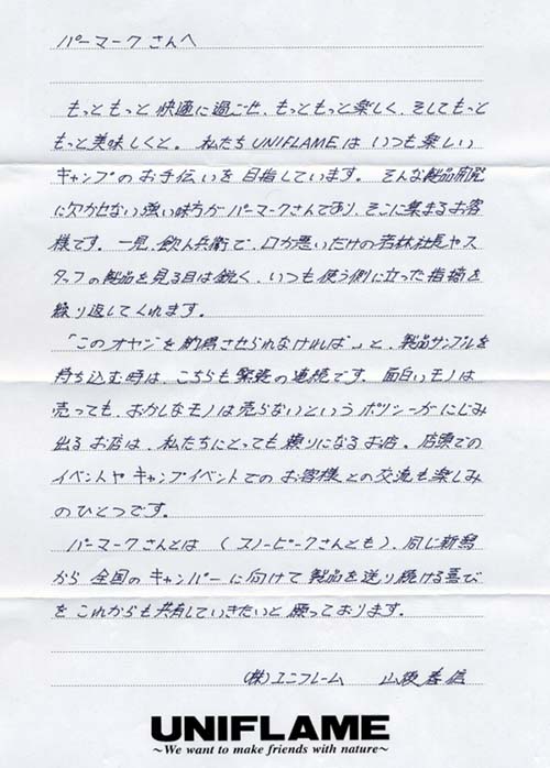 パーマークがユニフレーム、スノーピーク製品をお薦めする理由の一つとしてアフターサービスにあります。