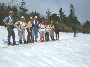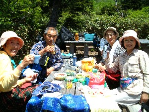 富士見平付近はまだこんなに雪が残っていました。とても7月とは思えません。 | お昼のひととき。山で食べるお弁当は、本当においしいですね。 | ||||||||||||||||||||