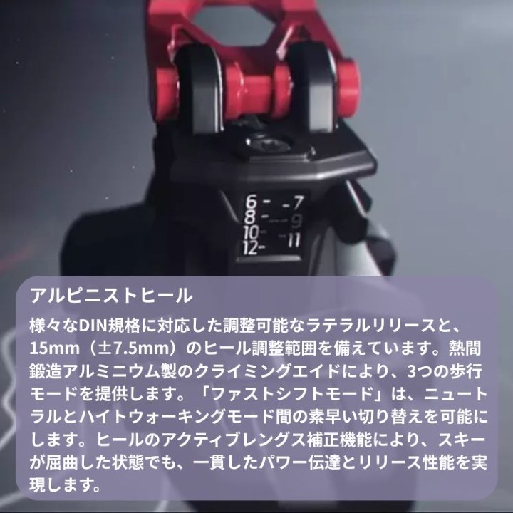 DIN4.0から11.0のアルピニストフリーディングは、ブレーキを含めてもわか395g。 アルピニストフリーのビンは、長い上りで1g、1gが重要なとき、最初の選択肢となることでしょう。 アルピニストフリービンディングは、長い上り坂や忘れられないフリーライドの下り坂で1グラムでも軽く滑りたいときにビンディングを選びます。ストヒールピースに加え、高剛性カーボン強化ISIトウピースを装備。 ピンレバーの巧みな運動力学により、わずかな力でピンをはめ込むことができます。 アルピニストのヒールピースは、15mmのフルアジャストレンジに加え、0°、5°、9°のクライミングエイドを備えています。 アルピニストフリースの広い穴の位置は、エッジの力への伝達を非常に良くし、全体的なものデザインはスキーのフレックス挙動に影響を与えないアクティブな長さ補正を可能にしています。アルピニストフリーは、リサイクルプラスチックやバイオベース・プラスチックなど、持続可能な素材を使用しています。
